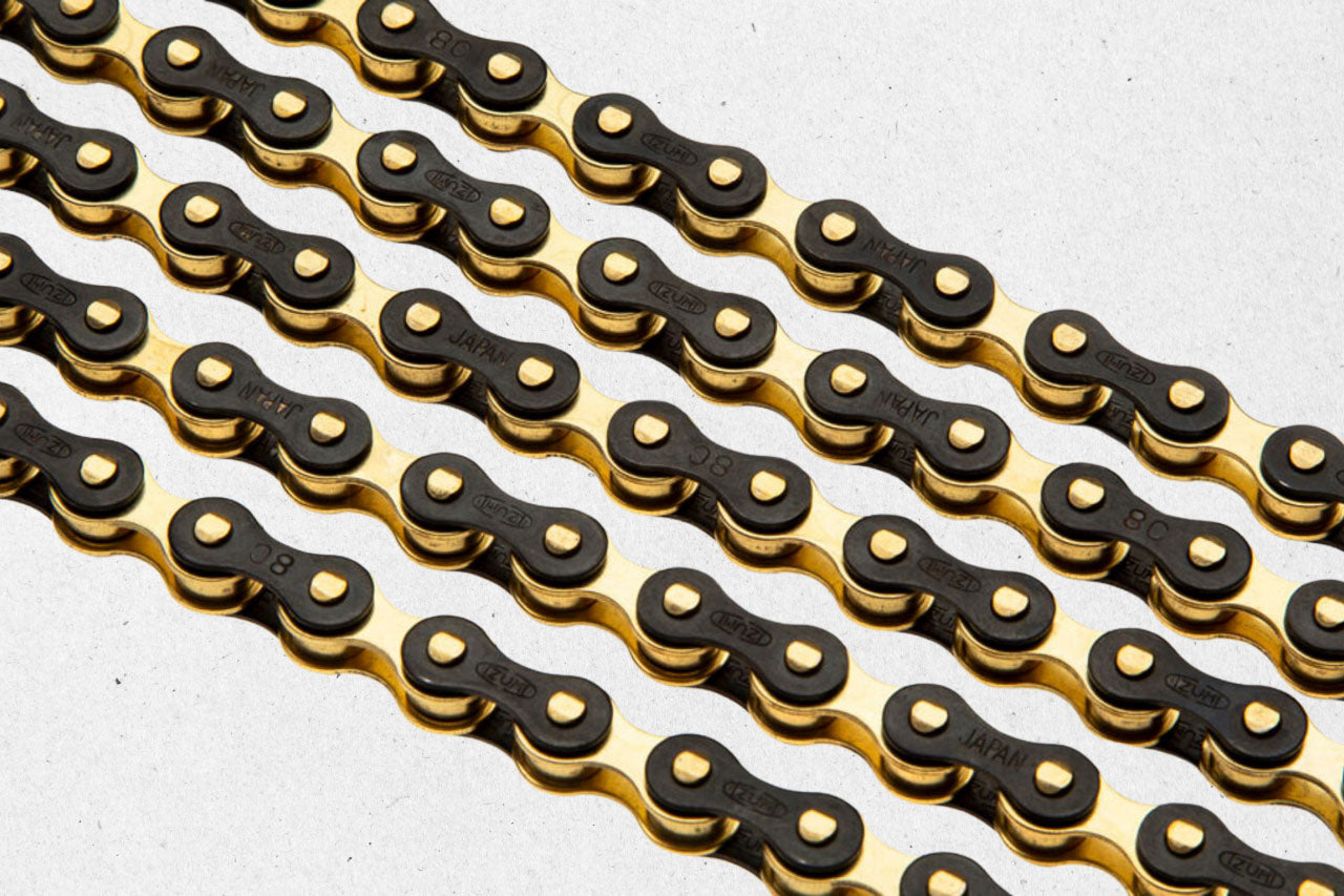 Avec la chaîne Izumi Jet Black Noir & Doré, performance et esthétique vont de pair. Son traitement en acier trempé assure une durabilité optimale, tandis que ses rivetages dorés apportent une touche distinctive à votre vélo. Pensée pour les fixies, BMX et single speed, elle garantit une transmission fluide et robuste, tout en offrant un look unique.