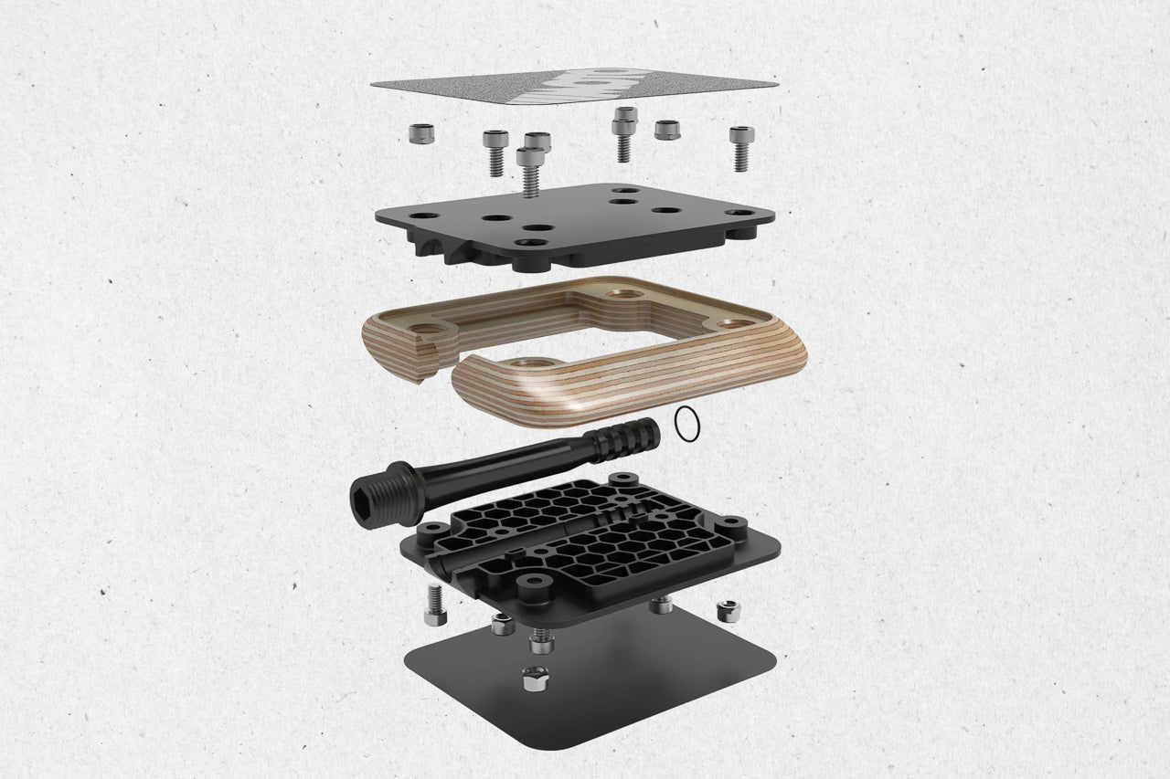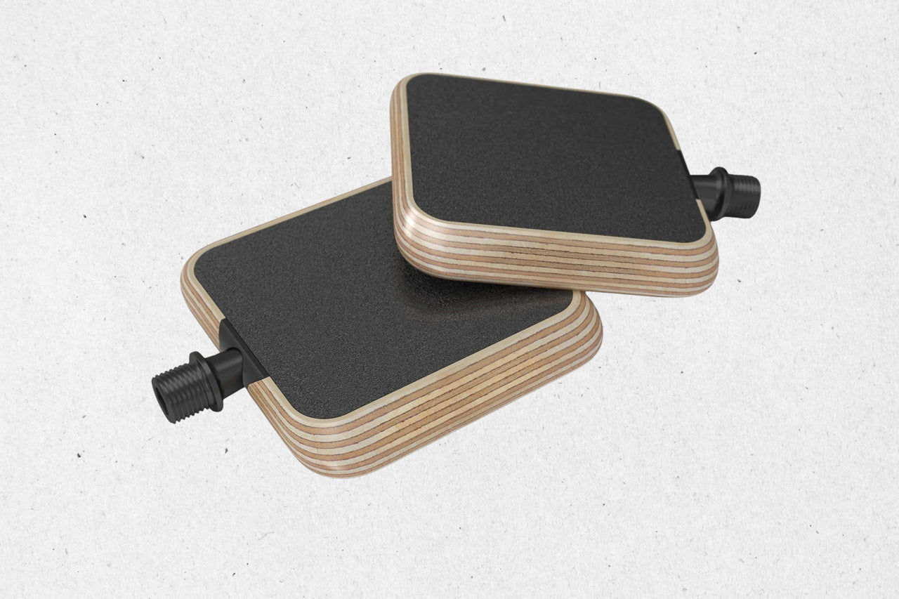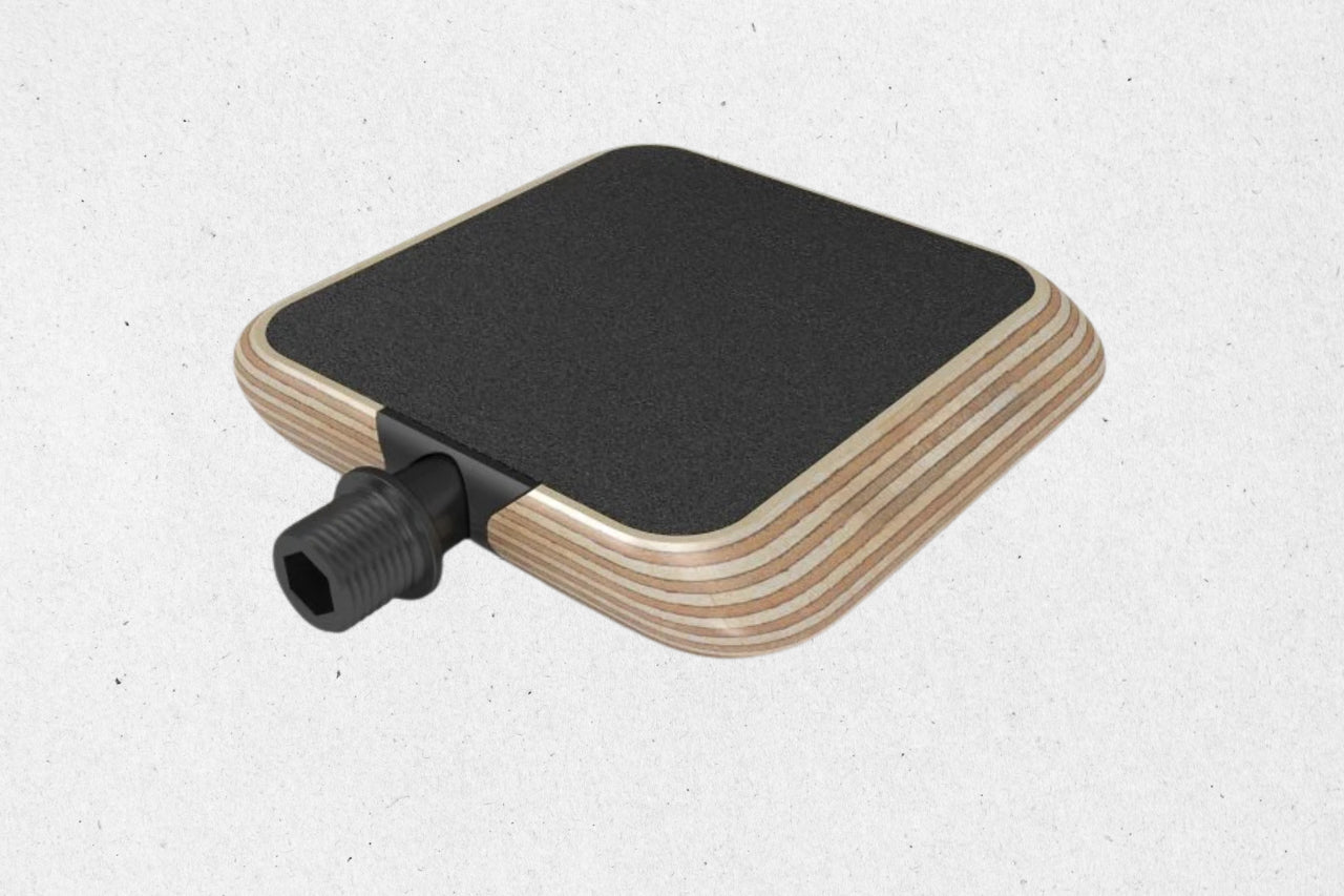 L’ensemble combine un axe en acier chromoly usiné, une plateforme renforcée et une surface antidérapante. Le cadre bois apporte une touche visuelle sobre et différente, tout en restant discret sur le vélo.